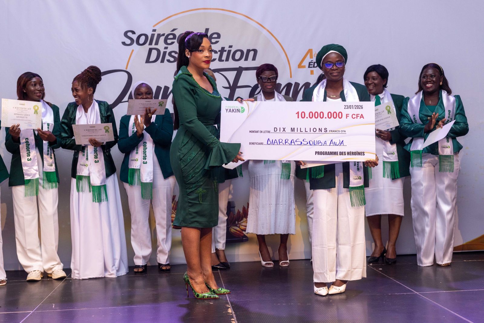 Les héroïnes du programme Héroïne ont également reçu leurs certificats de fin de formation, marquant l’aboutissement de plusieurs mois de renforcement de compétences. Parmi elles, Diarrassouba Awa, fondatrice de DIA GROUP, a été récompensée par un chèque de 10 000 000 FCFA pour soutenir son projet entrepreneurial, illustrant la volonté de la Fondation YAKIN d’accompagner concrètement les initiatives féminines à fort impact.